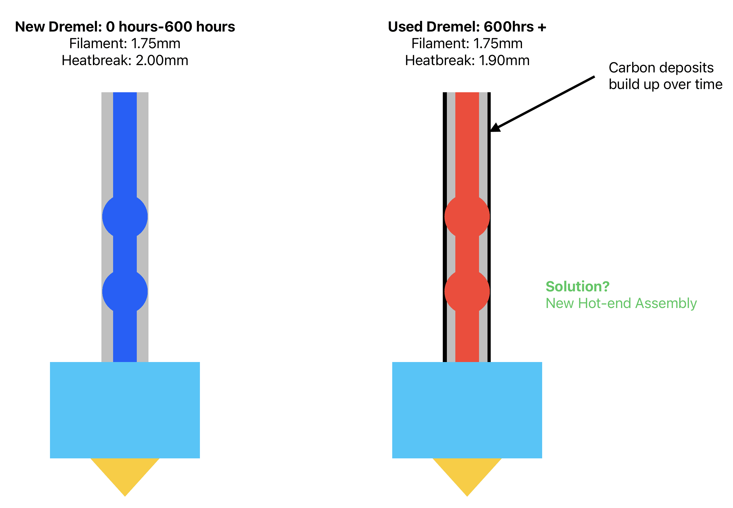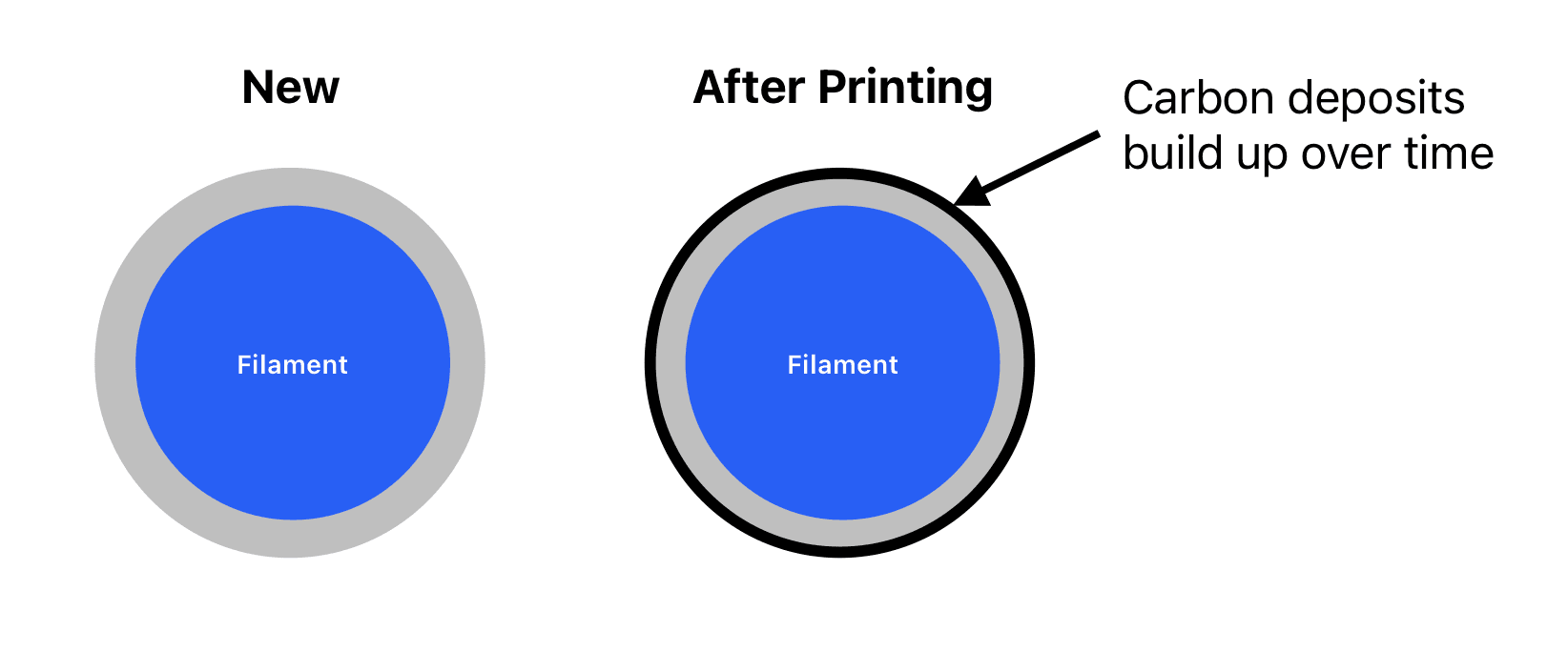 Any time you melt or burn something, carbon is a natural byproduct of the process (think about soot buildup in a chimney after a log fire is made). After miles of filament have been printed, these carbon deposits from the filament begin to cake onto the interior wall of the heat break. Meaning that 2.00mm opening is no longer 2.00mm wide, but perhaps now only 1.85 or 1.9mm wide.